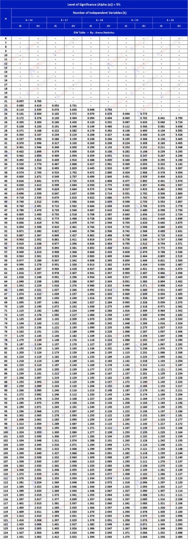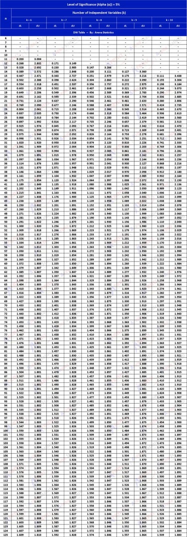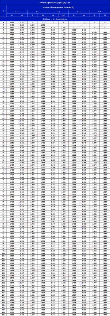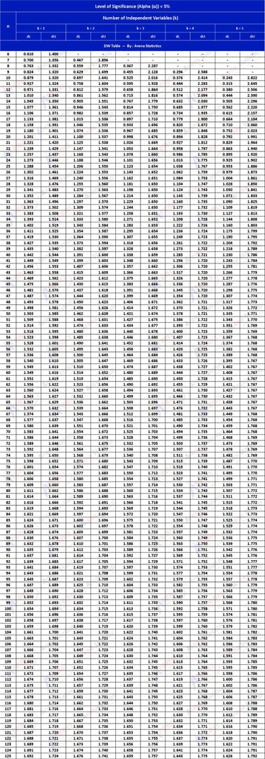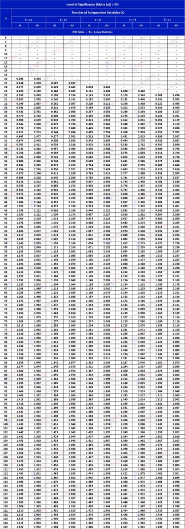 Untuk mendapatkan nilai Durbin Watson (DW) tabel secara manual, peneliti dapat menggunakan tabel Durbin Watson (tabel DW)