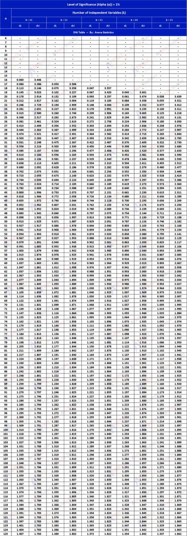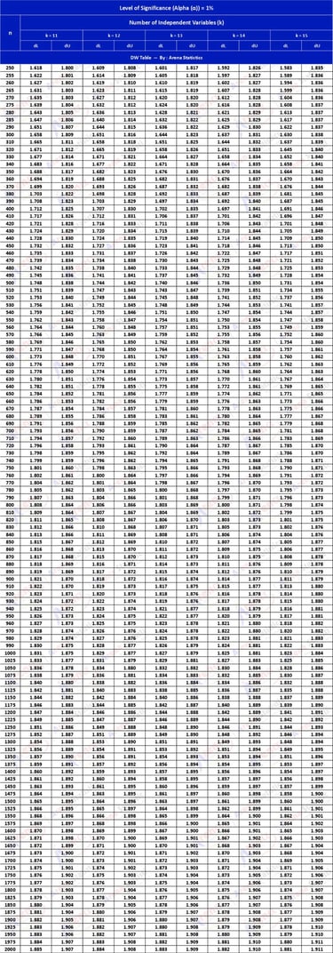DW Tabel dengan Alpha 1% ; observasi (n) = 250 - 2000 ; k = 11 - 15