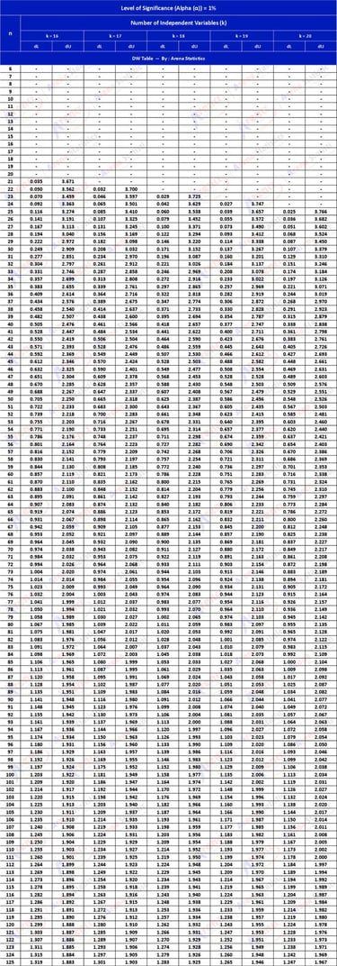 DW Tabel dengan Alpha 1% ; observasi (n) = 6 - 125 ; k = 16 - 20