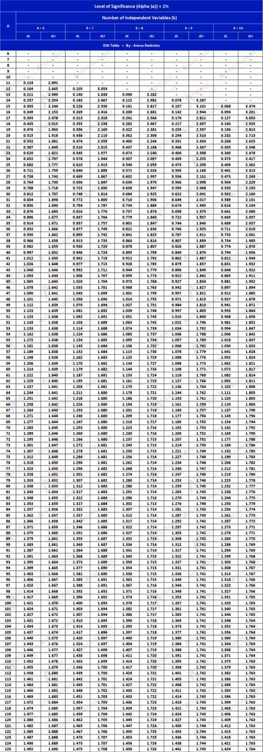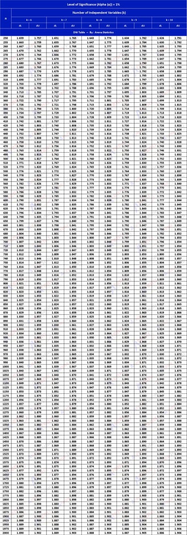 DW Tabel dengan Alpha 1% ; observasi (n) = 250 - 2000 ; k = 6 - 10