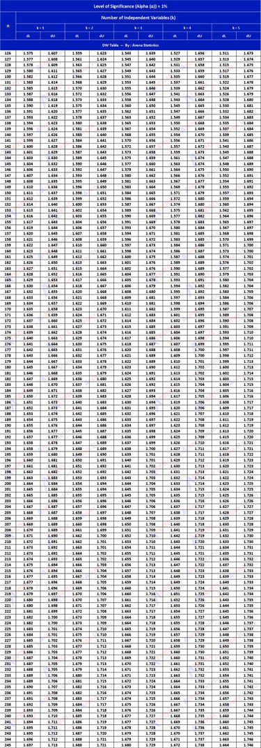 DW Tabel dengan Alpha 1% ; observasi (n) = 126 - 245 ; k = 1 - 5
