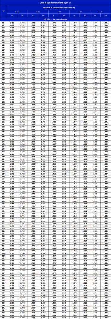 DW Tabel dengan Alpha 1% ; observasi (n) = 6 - 125 ; k = 11 - 15
