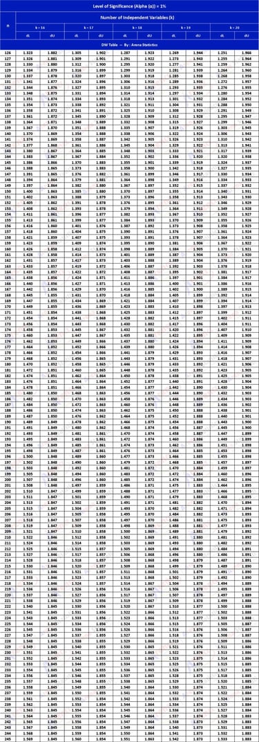 DW Tabel dengan Alpha 1% ; observasi (n) = 126 - 245 ; k = 16 - 20