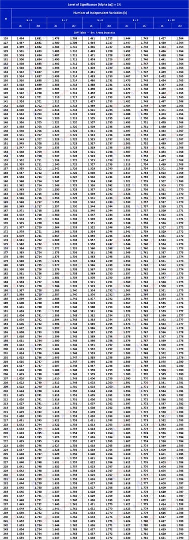 DW Tabel dengan Alpha 1% ; observasi (n) = 6 - 125 ; k = 6 - 10