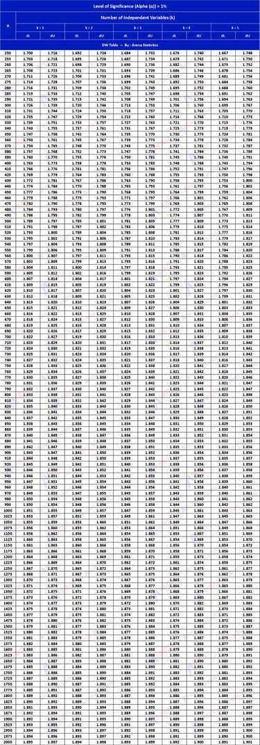 DW Tabel dengan Alpha 1% ; observasi (n) = 250 - 2000 ; k = 1 - 5