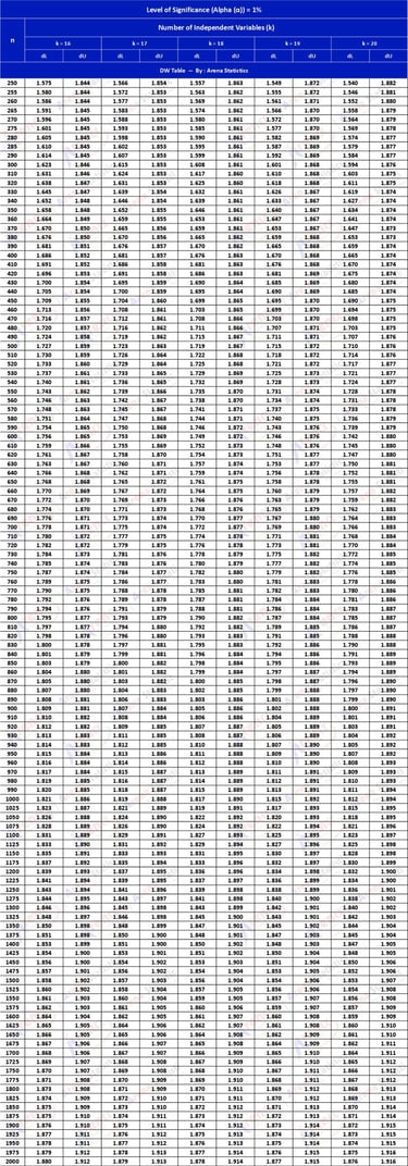 DW Tabel dengan Alpha 1% ; observasi (n) = 250 - 2000 ; k = 16 - 20