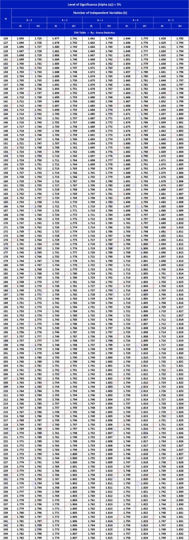 DW Tabel dengan Alpha 5% ; observasi (n) = 126 - 245 ; k = 1 - 5