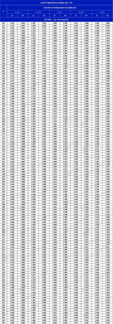 DW Tabel dengan Alpha 5% ; observasi (n) = 126 - 245 ; k = 11 - 15