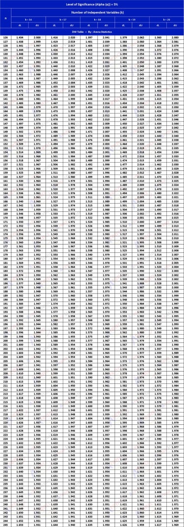 DW Tabel dengan Alpha 5% ; observasi (n) = 126 - 245 ; k = 16 - 20