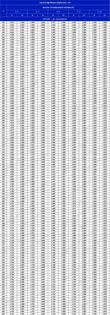 DW Tabel dengan Alpha 5% ; observasi (n) = 6 - 125 ; k = 6 - 10
