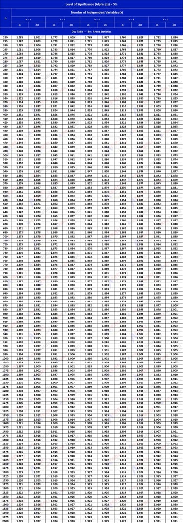 DW Tabel dengan Alpha 5% ; observasi (n) = 250 - 2000 ; k = 1 - 5