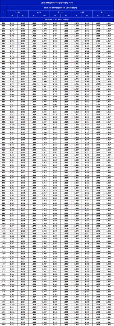 DW Tabel dengan Alpha 5% ; observasi (n) = 250 - 2000 ; k = 11 - 15