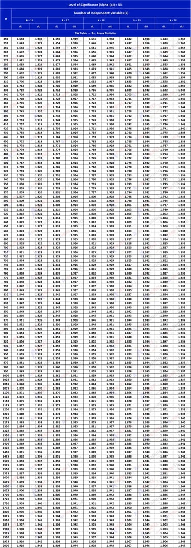 DW Tabel dengan Alpha 5% ; observasi (n) = 250 - 2000 ; k = 16 - 20