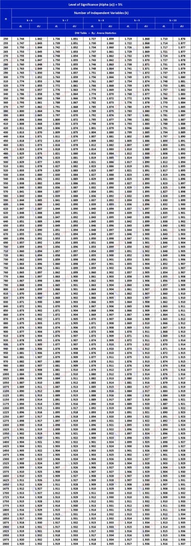 DW Tabel dengan Alpha 5% ; observasi (n) = 250 - 2000 ; k = 6 - 10