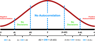 Salah satu teknik pengujian autokorelasi adalah Durbin Watson (DW). Konsep Durbin Watson (DW) adalah menghitung korelasi antara series residual pada derajat pertama (ρ(et-et-1)), yaitu korelasi residual periode saat ini dengan residual satu periode sebelumnya (lag 1) dengan formula sebagai berikut :